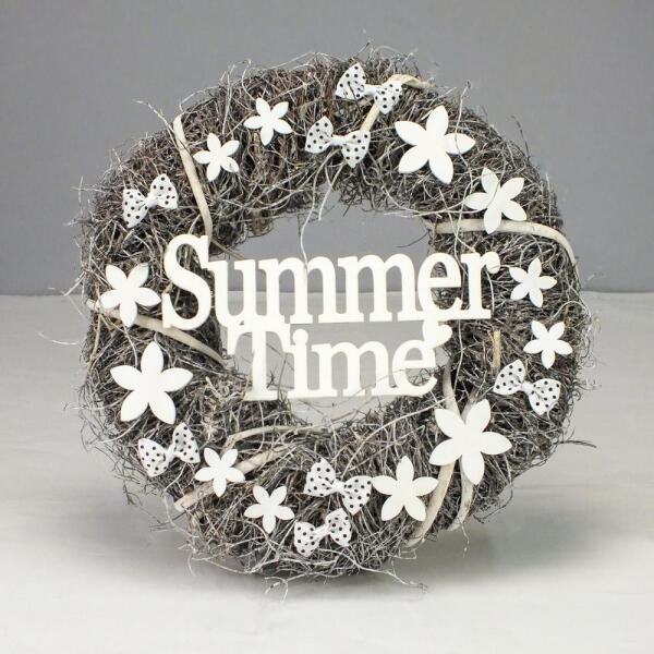 Üdvözöld a vendégeket a "Summer time" felirattal díszített szürke ajtókopogtató koszorúval! Ez a bájos és egyedi dekorációs elem tökéletes választás, hogy üdvözölj mindenkit otthonod ajtajában. A koszorú anyaga minőségi és tartós, így hosszú évekig szép marad. A szürke szín elegáns és könnyen kombinálható más dekorációkkal.