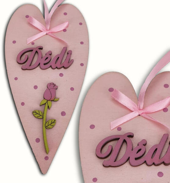 Anyák napi díszített szív fából, felakasztható, "DÉDI" felirattal.