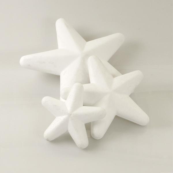 Hungarocell csillag, 15 cm Könnyű formák, amelyeket bármilyen dekorációs festékkel festhetünk, használhatunk sötétben világító festéket, csillámport, lakkozhatjuk vagy díszíthetjük repesztő lakkal. Ragaszthatunk a festett formára kagylókat, fadíszeket, száraz növényeket, zsinórokat, stb. Díszíthetjük szalvétatechnikával, teletűzdelhetjük varrható flitterekkel, amelyeket speciális rövid gombostűkkel erősíthetünk fel. Gyönyörű dekorációk készíthetők textil borítással, articsóka és patchwork technikával. Beboríthatjuk natúr papírokkal, vagy újságpapírral. 15 cm ø