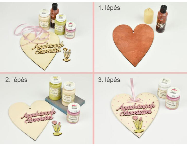 A fa szívet fesd le Decorolla lágy barack festékkel. A feliratot és a virágot is fesd le Decorolla lágy sárgászölddel és Decorolla mályva dekorfestékkel. Száradás után csiszold meg a felületeket.