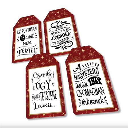Tedd még emlékezetesebbé az ajándékozást egy kis humorral! Ezek a vidám, saját gyártású nyomtatott dekorkartonból készült ajándékkísérő táblák garantáltan mosolyt csalnak az ünnepelt arcára. 4 különböző feliratú tábla egy csomagban. Könnyen rögzíthető (lyukkal ellátott a felfűzéshez). Ideális választás, ha egy kis játékosságot, kedvességet vagy csipetnyi iróniát vinnél az ajándékozásba! Méret 4x7cm