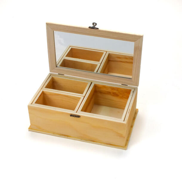 Natúr fából készült ékszertartó fadoboz. Csatos zárral, tükörrel ellátott tetővel és 3 kivehető rekesszel.