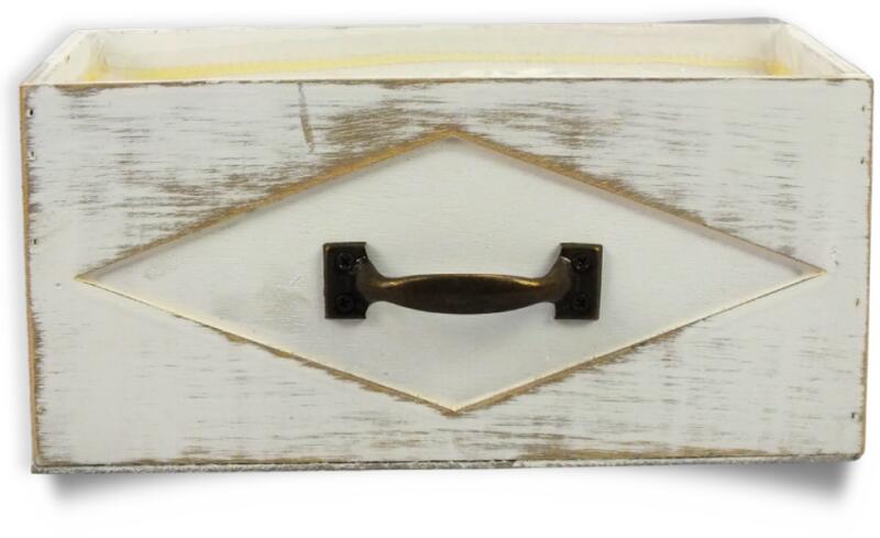 A fehér fa fiók fogantyúval, enyhén koptatott felülettel és bélelt belső résszel készül, így dekorációs és praktikus célokra egyaránt alkalmas. Rusztikus, vintage hangulatú megjelenése különleges karaktert ad az összeállításoknak. Bélelése miatt fűszernövények ültetésére is kiváló választás, de ajándékcsomagok alapjaként vagy szezonális díszítéshez is jól használható. Praktikus fogantyúja megkönnyíti a mozgatást, miközben esztétikus megjelenést biztosít. Méret: magasság 10,5cm, szélesség 13cm, hossz 22,5cm