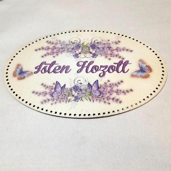 Horgolható színes ovális tábla 'Isten Hozott' felirattal, pillangós