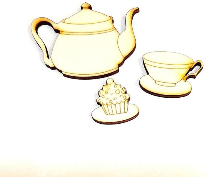 Lézervágott fafigurák, kanna, csészék és muffin. Festhetők, lazúrozhatók, ragaszthatók.