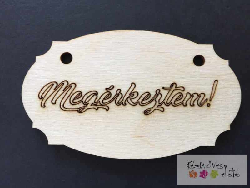 Megérkeztem feliratú tábla Méretei: - Magasság: 65 mm - Szélesség: 110 mm - Vastagság: 3 mm Anyaga: fa rétegelt lemez