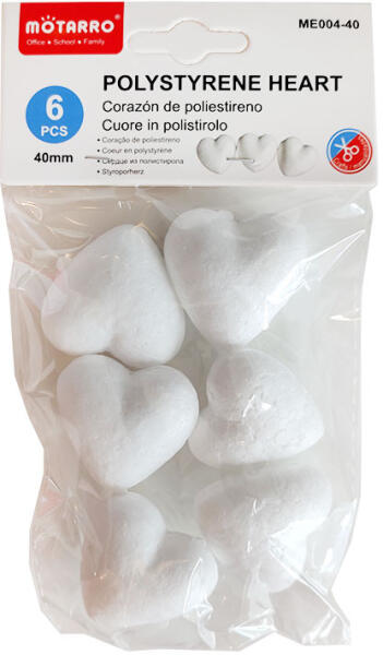 Festhető, dekorálható 40 mm-es Hungarocell szív. Egy csomag 6 db hungarocell szívet tartalmaz.