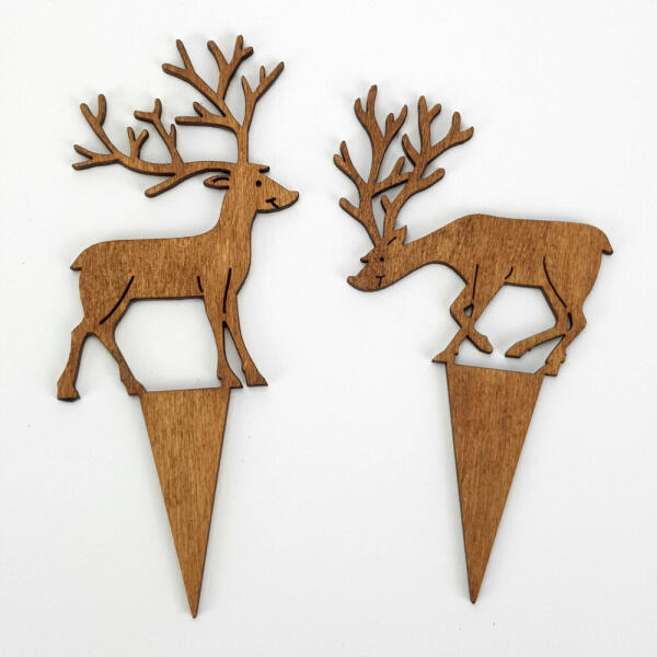 Natúr fából készített, barnára festett szarvasok. A beszúrós talp megkönnyíti a dekorációba való beillesztést és segít megúszni a ragasztással járó nehézségeket. Így utólag is megváltoztathatjuk a szarvasok helyét a készítményben.