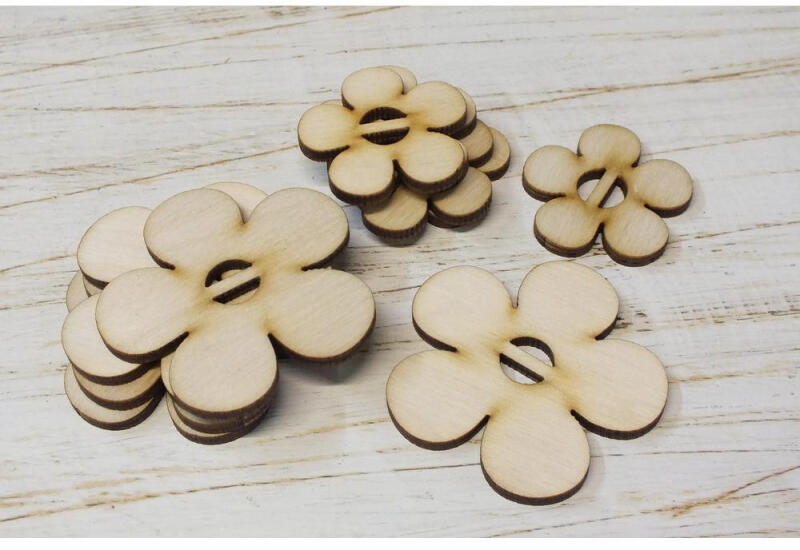 Szalagra fűzhető virágok. A csomag tartalma 5db 3,5m átmérőjű és 5db 5cm átmérőjű fa virág Ajánljuk kreatív alkotásokhoz, virágcsokrokhoz és esküvői dekorációhoz egyaránt.