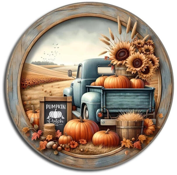 Nyomtatott fa tábla koszorú közép - Őszi táj kék teherautóval 11, 8cm - papelito