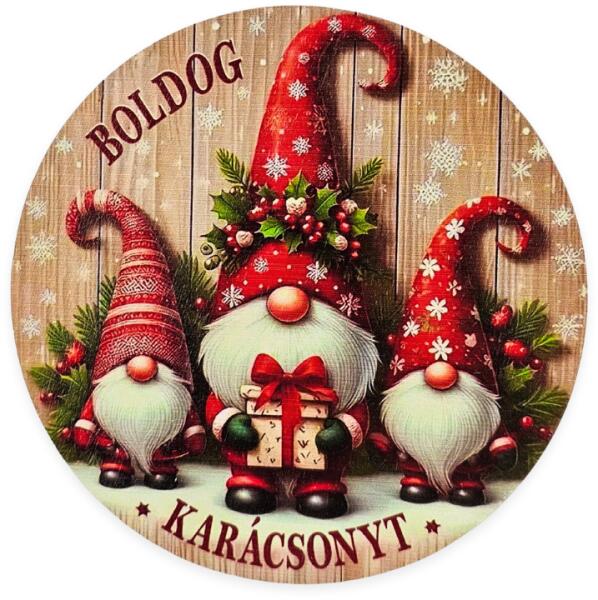 Nyomtatott fa tábla koszorú közép - Piros manók 11, 8cm