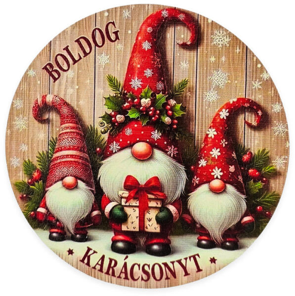Nyomtatott fa tábla koszorú közép - Piros manók 11, 8cm - papelito