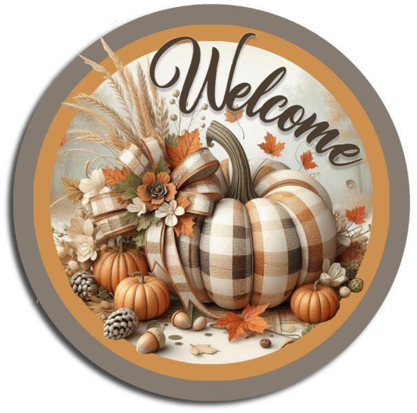 Nyomtatott fa tábla koszorú közép - Welcome kockás tökkel 11, 8cm 2676